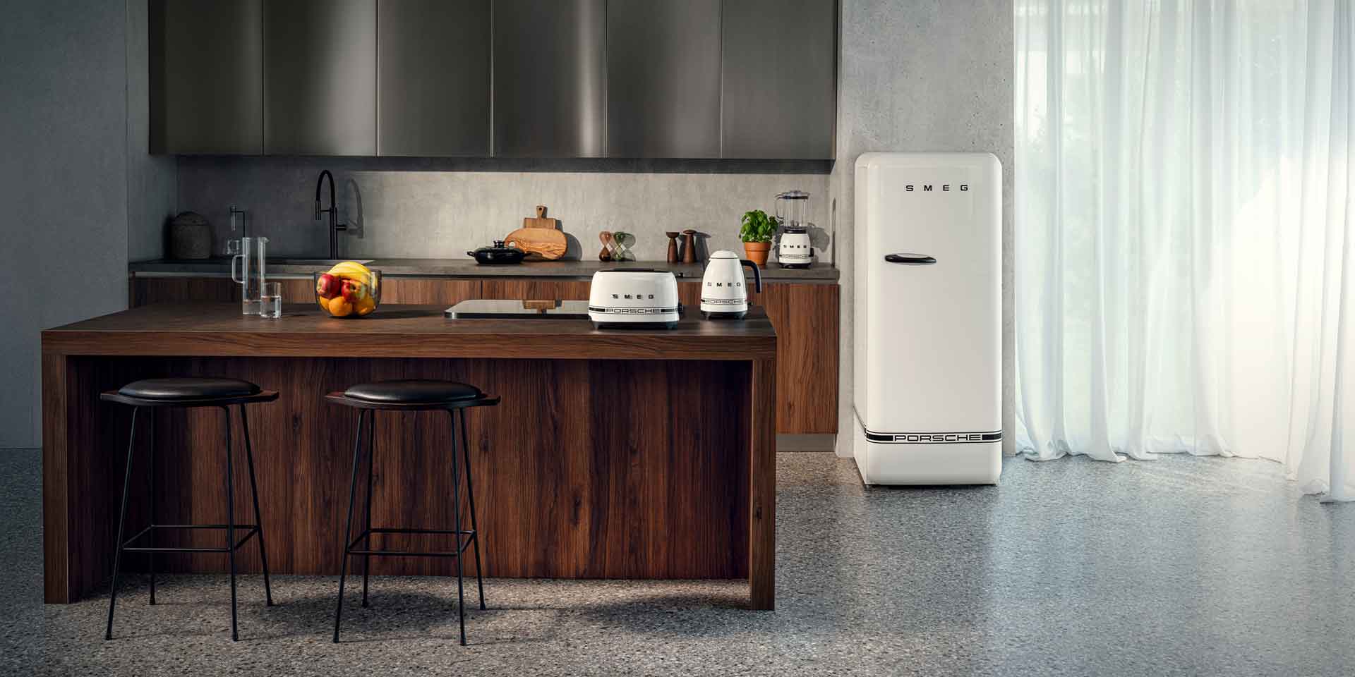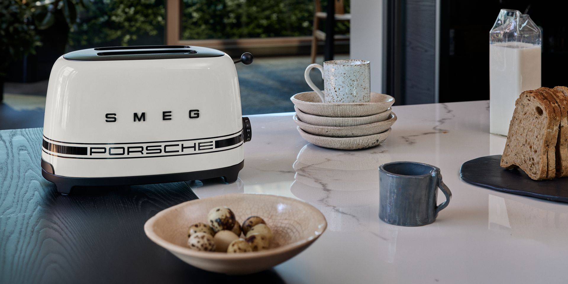 A finish that speaks in light and precision. The Porsche x SMEG Carrara White collection reveals a cool, mineral clarity that sharpens lines and proportions, elevated by matte‑black accents that frame each silhouette. High‑performance fridge, toaster, kettle and blender that are a statement of balance and purpose for those who value unmistakable design.