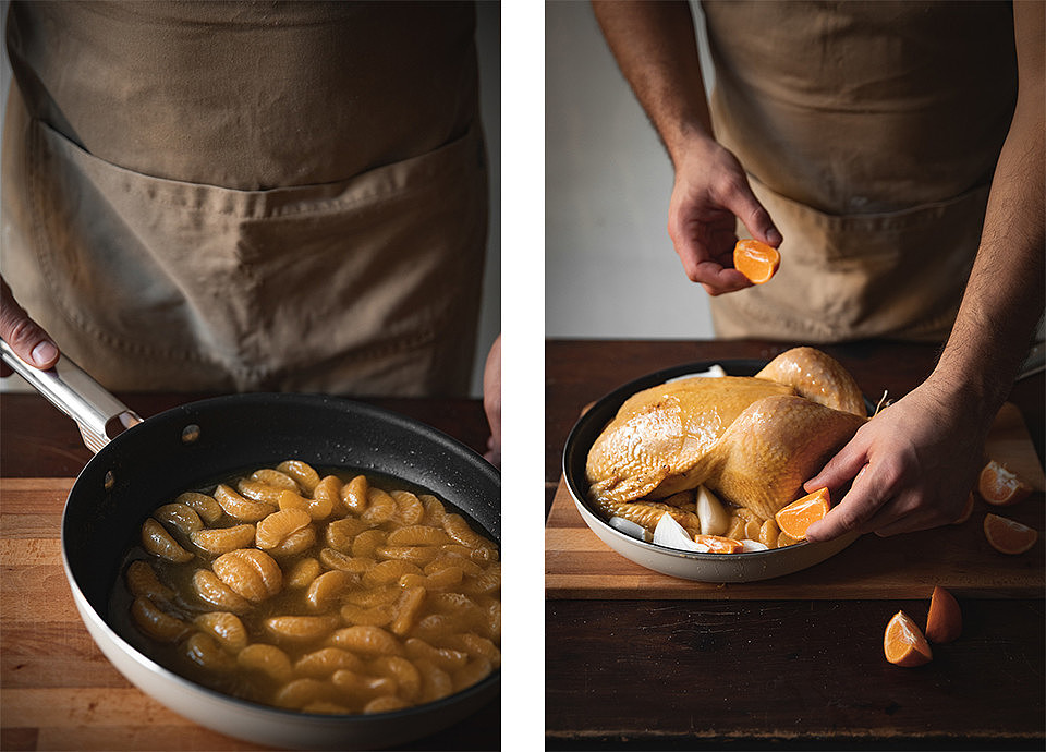 Una volta terminato il tempo di marinatura, preparare il fondo di cottura. In una casseruola, unire clementine, vaniglia e rum per creare una base ricca e profumata, che sarà usata per cuocere e insaporire il cappone durante la cottura.