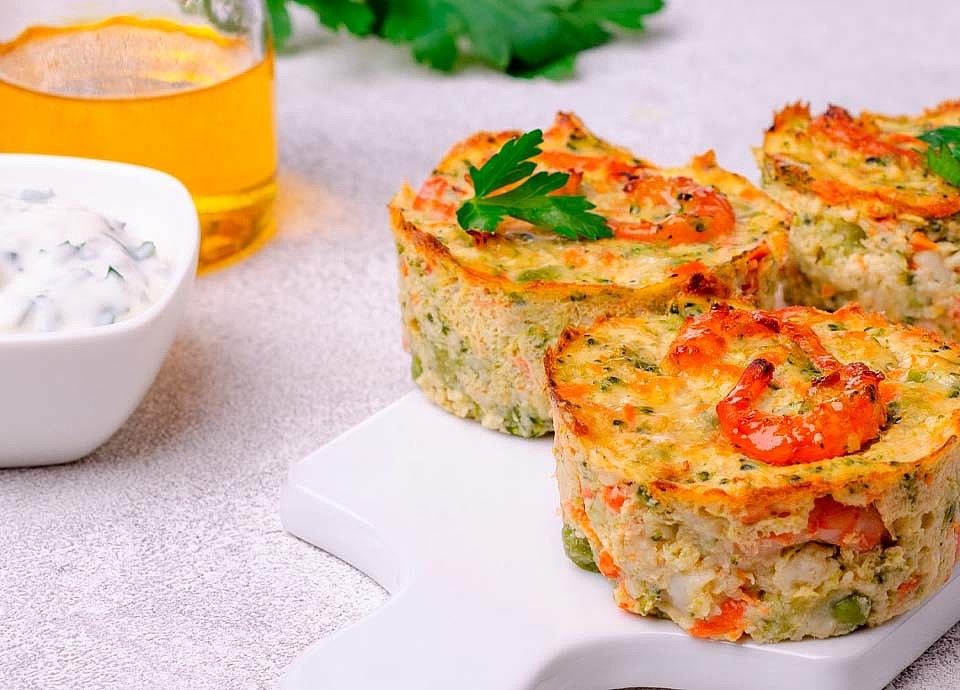 Butter the cups. Add an equal portion of zucchini and shrimp to each mold. Finish with the flan base remaining a few mm below the edge.